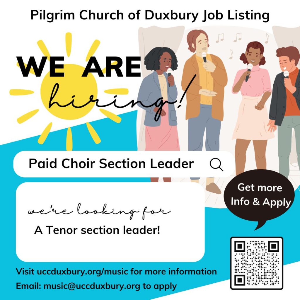 If you, or someone you know, may be interested in these positions, please contact Claire DeCusati, Music Director of Pilgrim Church, at music@uccduxbury.org.  The positions will remain open until filled.